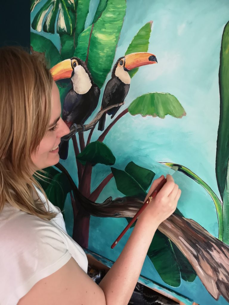 Hallo! Mijn naam is Jeltje, ik ben 36 jaar en woon in Nijmegen, samen met mijn zoontje, vriend en kat. Ik ben gespecialiseerd in het maken van muurschilderingen, vooral voor baby- en kinderkamers. Al van jongs af aan heb ik een passie voor schilderen en tekenen, en ik vind het geweldig om ruimtes om te toveren tot een fantasiewereld vol kleur en creativiteit.